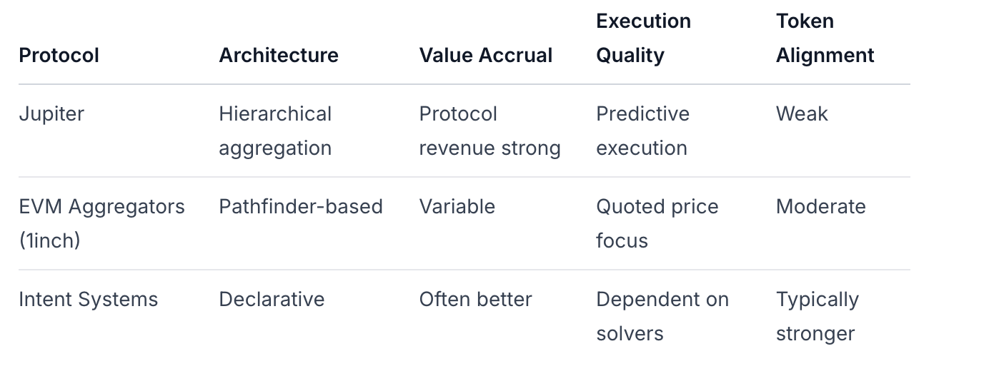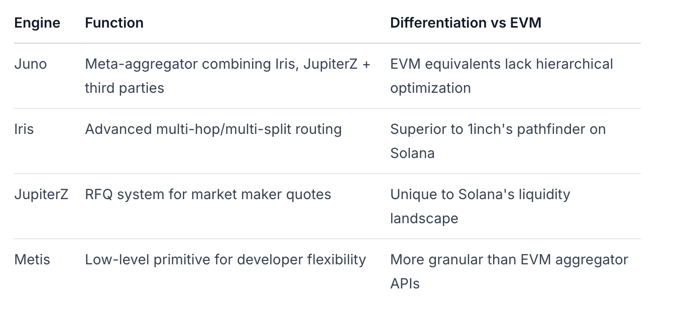 En comparación con los agregadores de EVM, la arquitectura de Jupiter aprovecha las capacidades de ejecución paralela de Solana para una lógica de enrutamiento más sofisticada y un asentamiento más rápido.
