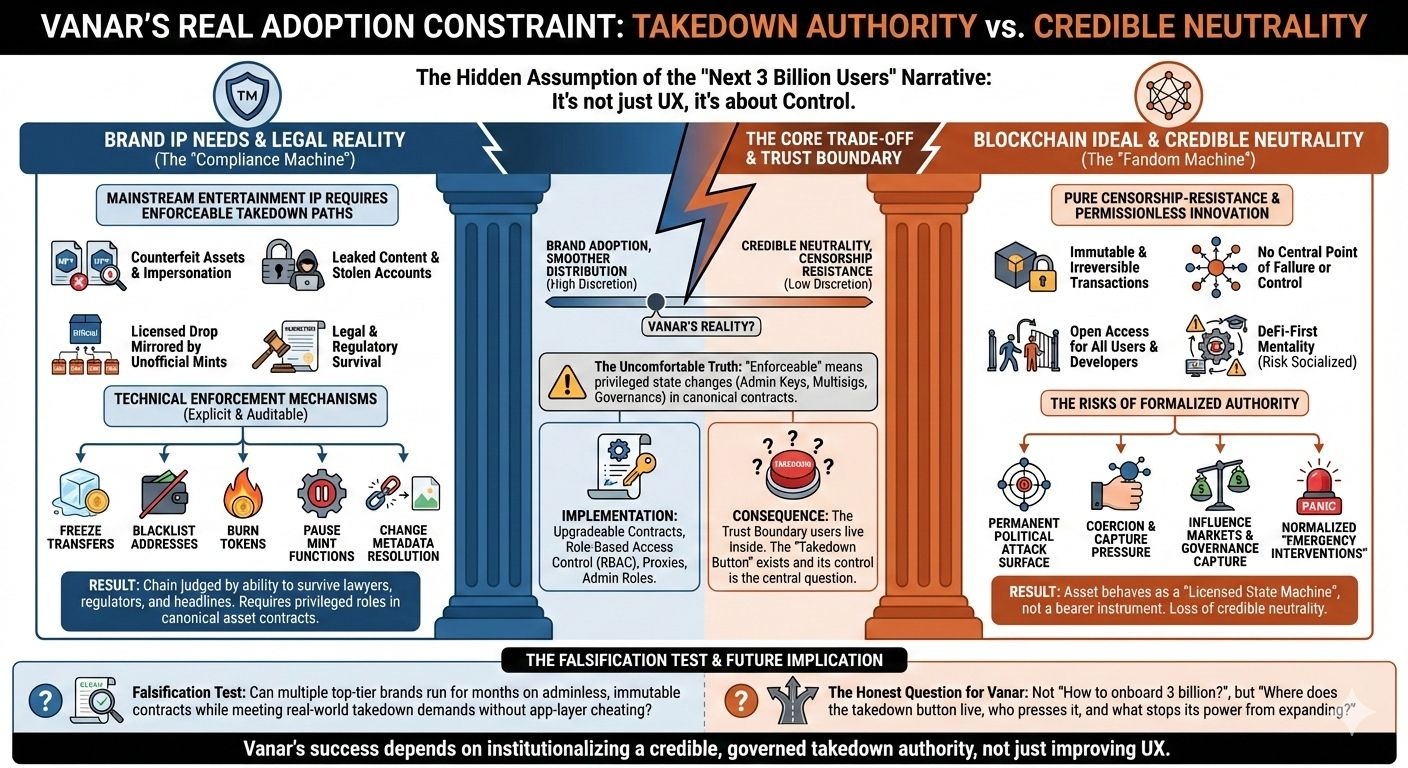 Con Vanar vendiendo una historia de 'los próximos 3 mil millones de usuarios' a entretenimiento y marcas, noto la misma suposición oculta: que la adopción del consumidor es principalmente un problema de producto. Mejores billeteras, tarifas más baratas, un proceso de incorporación más fluido, y el resto sigue. Para la propiedad intelectual de entretenimiento convencional, creo que eso es al revés. La primera pregunta seria que hace una marca no es cuán rápido se finalizan los bloques, sino qué sucede cuando algo sale mal en público. Activos falsificados. Suplantación. Contenido filtrado. Cuentas robadas. Un lanzamiento autorizado siendo reflejado por mil acuñaciones no oficiales en minutos. En ese mundo, una cadena no se juzga por su rendimiento. Se juzga por si hay un camino de eliminación ejecutable que pueda sobrevivir a un abogado, un regulador y un titular.