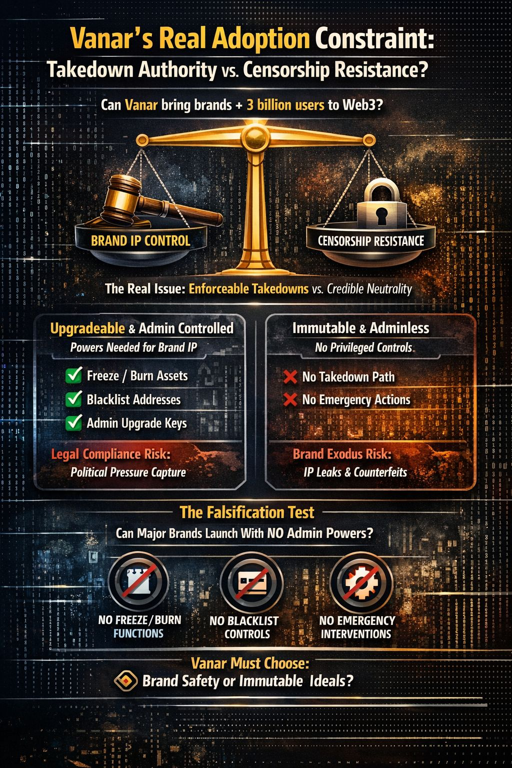 La tesis tiene una prueba de falsificación clara, y me gustan los ángulos que pueden ser avergonzados por la realidad. Si múltiples lanzamientos de marcas de primer nivel pueden funcionar durante meses en contratos de activos inmutables sin administrador mientras aún cumplen con las demandas de eliminación del mundo real, el argumento se debilita. La evidencia sería visible: sin funciones privilegiadas de congelación, quema, pausa o lista negra en los contratos canónicos, y sin intervenciones de gobernanza de emergencia que actúan efectivamente como mecanismos de eliminación. No “podríamos si tuviéramos que hacerlo”, sino “no lo hicimos, y la marca aún operó”. Si eso sucede a gran escala, entonces tal vez el mercado tiene razón en que la adopción del consumidor es principalmente UX. Mi apuesta es que no sucederá, porque la propiedad intelectual convencional es una máquina de cumplimiento que finge ser una máquina de fandom, y la cadena que la alberga heredará esa maquinaria, ya sea que lo admita o no.