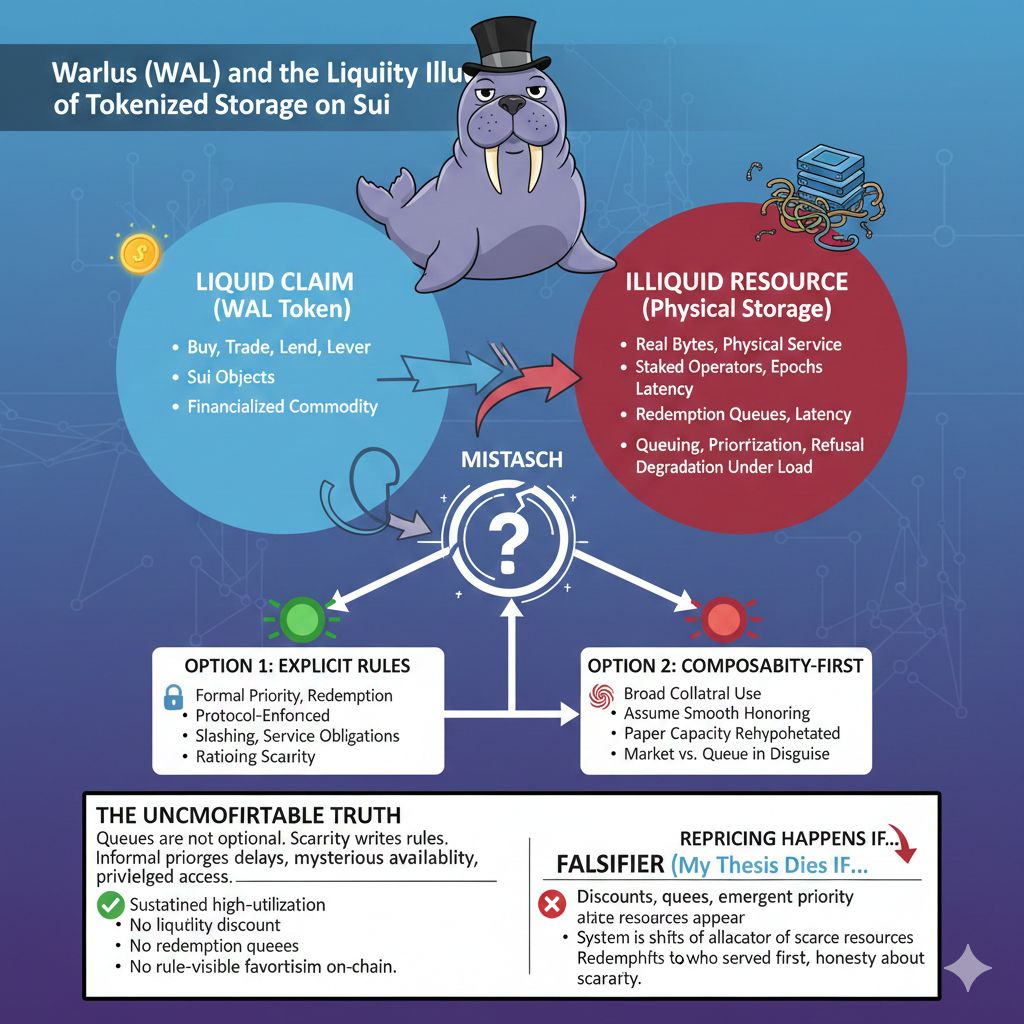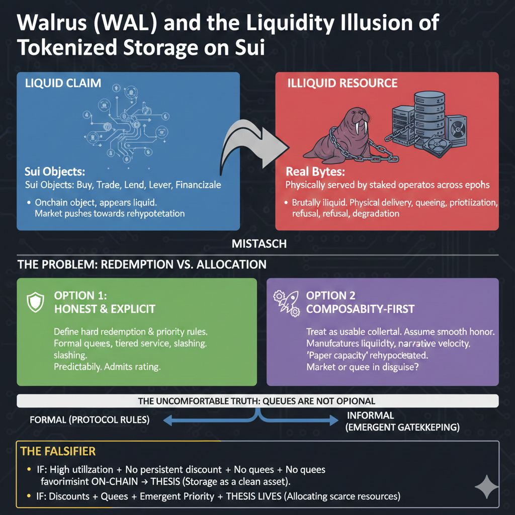 Por eso sigo volviendo a la tensión de “reclamación líquida vs recurso ilíquido” como el núcleo de la apuesta. La tokenización invita al apalancamiento. El apalancamiento invita a pruebas de estrés. Las pruebas de estrés obligan a decisiones de asignación. Las decisiones de asignación se convierten en reglas de protocolo o poder social. Si Walrus quiere que los objetos de capacidad se comporten como colateral creíble de almacenamiento como activo en Sui, tiene que elegir entre reglas de racionamiento explícitas en cadena o control emergente por el conjunto de operadores apostados bajo carga.
