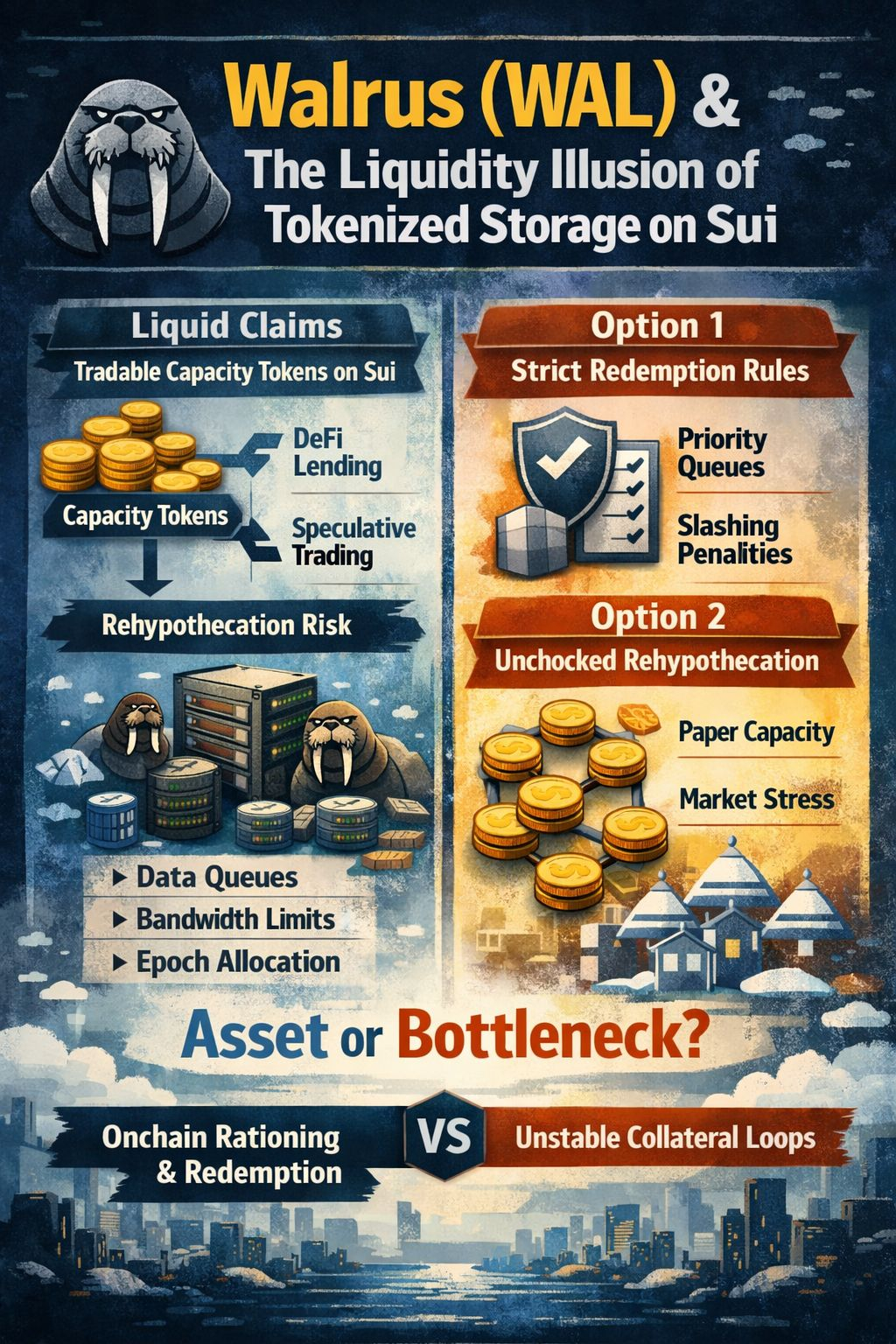 Cuando las personas dicen “almacenamiento tokenizado”, hablan como si Walrus pudiera convertir la capacidad de almacenamiento y los blobs en objetos Sui que se comportan como una simple mercancía que puedes financiar: comprarlo, comerciarlo, prestarlo, apalancarlo y confiar en que el mercado lo liquide. No creo que ese modelo mental sobreviva al contacto con Walrus. Convertir la capacidad de almacenamiento y los blobs en objetos negociables en Sui hace que la afirmación parezca líquida, pero lo que estás reclamando es brutalmente ilíquido: bytes reales que deben ser servidos físicamente por un conjunto de operadores apostados a través de épocas. La discrepancia importa, porque los mercados siempre empujarán cualquier reclamo líquido hacia la rehypotecación, y cualquier sistema que resuelva la entrega física sobre eso debe elegir dónde quiere que aparezca el dolor.