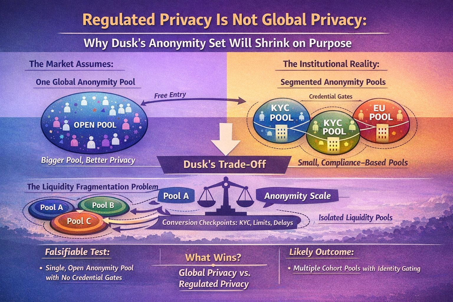 Aquí es donde radica la fijación de precios errónea. La mayoría de los inversores consideran la privacidad como una característica que escala con la adopción: mayor volumen, más usuarios, mayor conjunto de anonimato, mayor privacidad. Con la privacidad regulada, una mayor adopción institucional puede influir en el sistema en sentido contrario. Cuantas más instituciones se incorporen, mayor será la presión para explicitar la elegibilidad, de modo que la afirmación de "¿quién podría haber sido mi contraparte?" sea una afirmación defendible. Por eso creo que Dusk se valora como si heredara la dinámica de "mayor pool, mejor privacidad", cuando la dinámica más probable es "mayor cumplimiento, más pools, pools más pequeños". Si Dusk termina con múltiples pools protegidos o indicadores de elegibilidad explícitos en parámetros públicos, la suposición del mercado se romperá a simple vista.