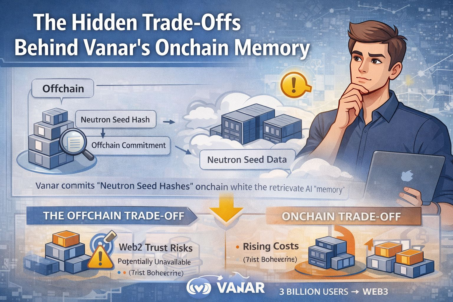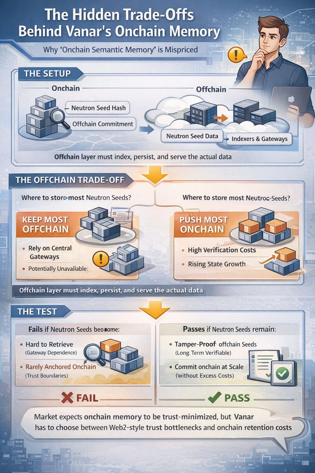 Cuando escucho “memoria semántica en cadena”, mi primera reacción no es emoción, sino sospecha. No porque la idea sea incorrecta, sino porque la gente valora la frase como si las Semillas Neutrones estuvieran en cadena por defecto, cuando el defecto es un ancla en cadena que aún depende de una capa de recuperación e indexación fuera de la cadena que funcione bien. En la práctica, la memoria semántica solo tiene las propiedades que realmente pagas, y el diseño de la Semilla Neutrón de Vanar al ser fuera de la cadena por defecto es el detalle que decide si la “memoria” es un primitivo minimizado en confianza o una capa de disponibilidad al estilo Web2 con un compromiso en cadena.