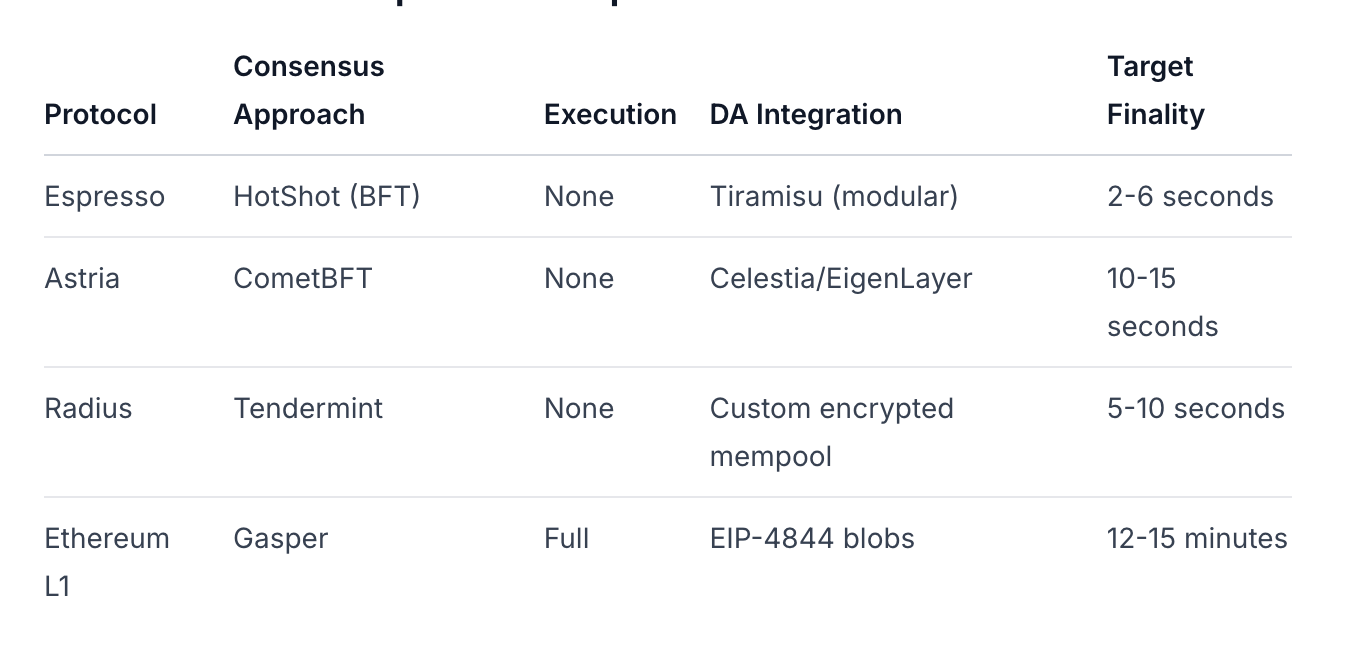 La principal ventaja de Espresso es su arquitectura diseñada específicamente para el caso de uso de secuenciación, mientras que los competidores adaptan protocolos de consenso existentes.