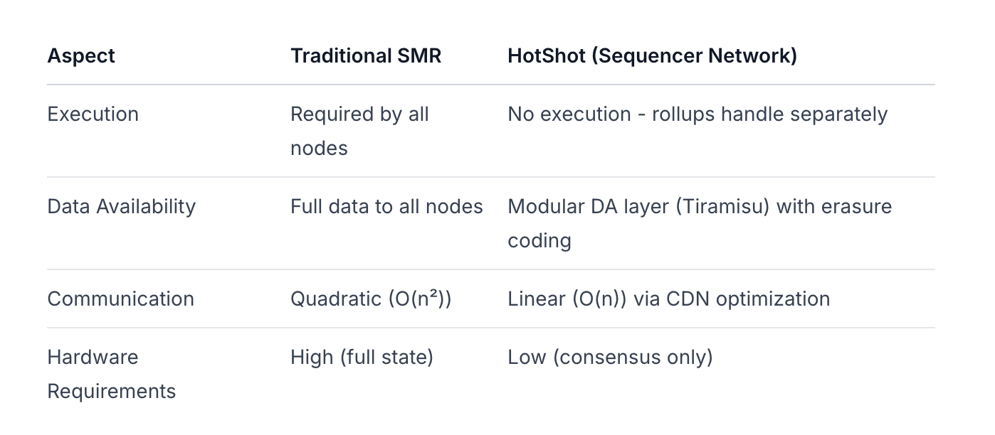 La innovación central de Espresso es HotShot - un protocolo de consenso BFT optimista y sin líderes diseñado específicamente para la secuenciación (no ejecución). La arquitectura difiere fundamentalmente de los sistemas tradicionales de replicación de máquinas de estado: