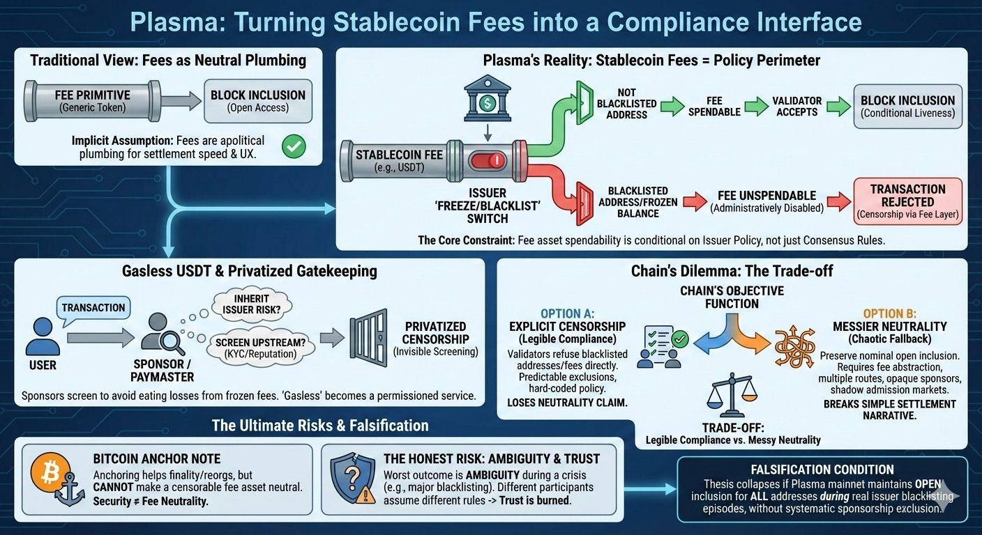 El riesgo honesto es que la característica más diferenciada de Plasma se convierta en su responsabilidad más costosa. El gas primero en stablecoin parece una estandarización, pero también estandariza la exposición de la cadena a intervenciones del emisor. Un solo evento de inclusión en listas negras de alto perfil puede obligar a toda la red a revelar su postura de gobernanza real en tiempo real. O los validadores comienzan a hacer cumplir la política directamente, o el ecosistema de patrocinadores se ajusta y los usuarios descubren que “sin gas” en realidad significa “servicio con permiso.” El peor resultado no es la censura per se. Es la ambigüedad. La ambigüedad es donde la confianza se quema, porque diferentes participantes asumirán diferentes reglas hasta que una crisis obligue a una interpretación unilateral.
