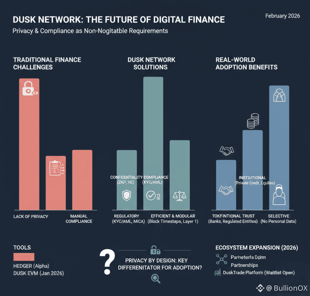 The ecosystem is expanding steadily around this vision. Partnerships with regulated entities show that real tokenized volume can be handled without compromising confidentiality. The upcoming DuskTrade platform, phased for 2026 with waitlist already open, will extend these capabilities to compliant issuance and secondary trading of tokenized securities.