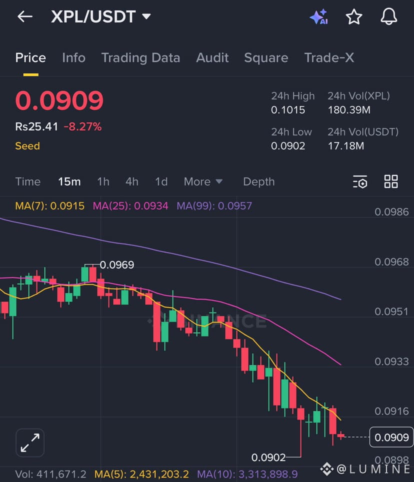 $XPL is trading around $0.091, sitting near recent lows after a strong rejection from the $0.21 area. The daily chart shows a clear downtrend, with price staying below key moving averages a sign sellers are still in control for now.