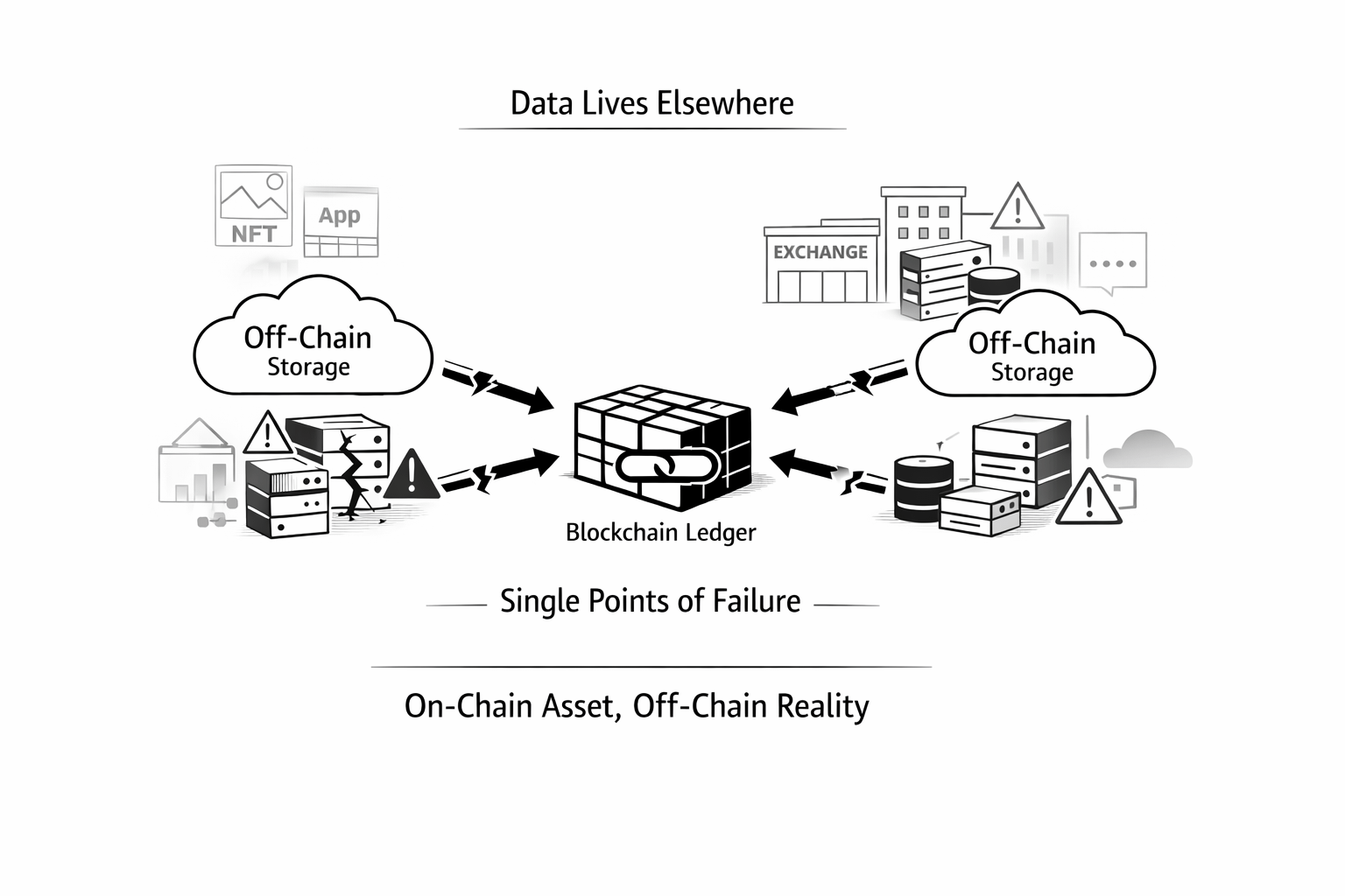 Modern blockchains were never designed to be data systems. They excel at ordering transactions and enforcing rules, but when it comes to storing information, most networks rely on a fragile compromise: data lives off-chain, while the blockchain merely points to it. This architectural shortcut has shaped much of Web3’s infrastructure—and it is also one of its biggest weaknesses.