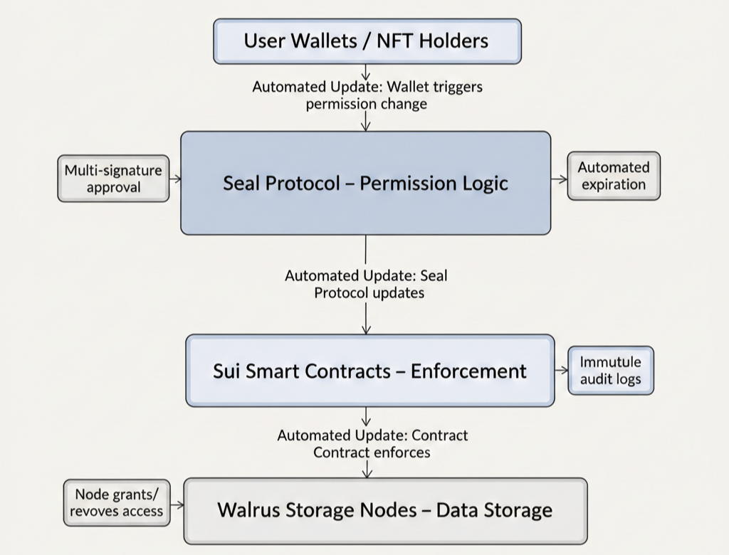 Here's a concrete example of what programmable permissions enable. A corporate project stores sensitive documents on Walrus with Seal Protocol managing multi-signature access. Documents require approval from three of five executives to view. When executives change, permissions update automatically through Sui contract logic. When documents expire after retention periods, access revokes automatically. Everything auditable on-chain without centralized management.