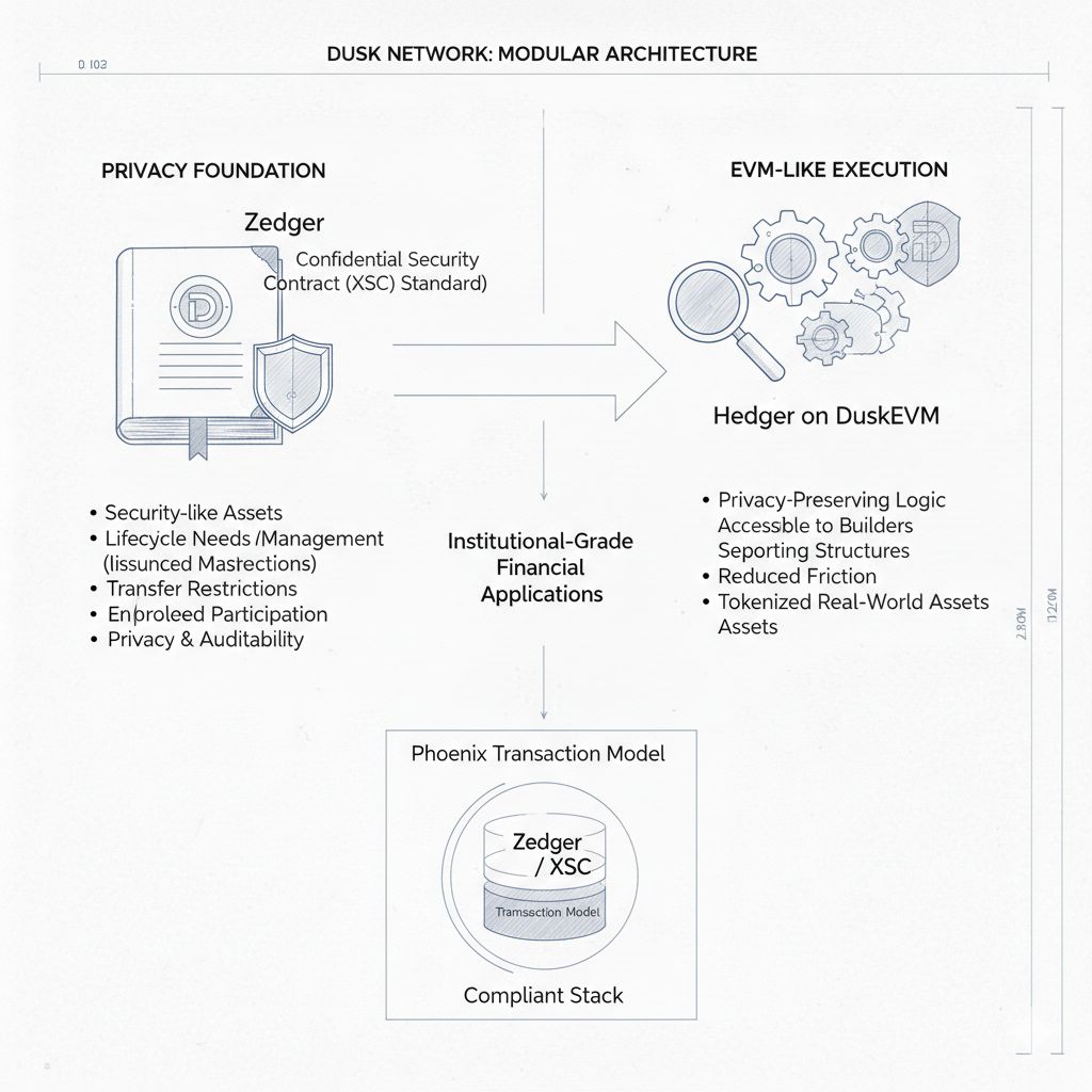 La arquitectura modular de Dusk es básicamente el proyecto diciendo que quiere ser una base para aplicaciones financieras de grado institucional, DeFi compliant, y activos del mundo real tokenizados, mientras mantiene la privacidad y la audibilidad integradas en el diseño, y lo interesante es que la historia de la arquitectura ya no es solo teórica, porque la documentación describe componentes distintos que reflejan una mentalidad de pila real, donde Zedger y XSC representan una forma central de manejar la lógica de activos regulados, mientras que Hedger ejecutándose en DuskEVM apunta hacia un camino donde la lógica que preserva la privacidad se vuelve más accesible para los constructores en un entorno de ejecución similar a EVM, lo cual es estratégicamente importante porque la adopción no se trata solo de tener la mejor criptografía, la adopción también se trata de reducir la fricción que impide que los desarrolladores y productos sean enviados en tu cadena en primer lugar.