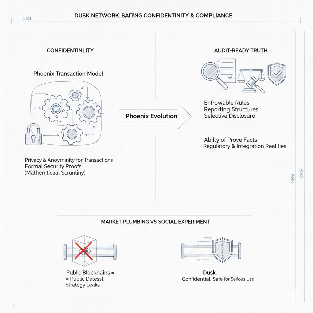 Una gran parte de ese trabajo “detrás de escena” es el modelo de transacción Phoenix, que Dusk presenta como una forma de traer privacidad y anonimato a las transacciones y el comportamiento de contratos inteligentes, y lo que destaca aquí es que Dusk ha enfatizado públicamente las pruebas de seguridad formales para Phoenix, porque eso es un tipo diferente de señal que el lenguaje de marketing, ya que sugiere que el equipo está pensando en cómo se comporta el sistema bajo un escrutinio serio en lugar de solo cómo suena en una presentación, y también han discutido la evolución futura de Phoenix para coincidir con realidades regulatorias e de integración, que es un punto sutil pero importante, porque muestra que están tratando la privacidad como un componente que tiene que funcionar dentro de restricciones reales, no una vibra que se declara y luego se olvida.