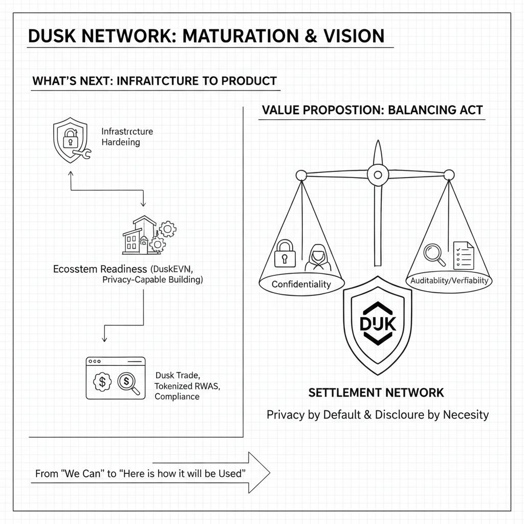 Si preguntas qué sigue, la respuesta clara es que Dusk está claramente avanzando más profundamente en la fase donde el endurecimiento de la infraestructura, la preparación del ecosistema y las experiencias orientadas al producto importan tanto como la teoría del protocolo, porque el aviso del incidente en sí mencionó un plan de seguimiento para la reapertura del puente, mientras que la dirección más amplia de la pila implica un enfoque continuo en la ejecución de DuskEVM y la construcción capaz de privacidad, y en el lado del producto, la presencia de mensajes de Dusk Trade sobre RWAs tokenizados y enmarcamiento de cumplimiento sugiere que Dusk quiere mostrar cómo puede verse el punto de entrada del usuario final una vez que esos rieles estén listos, que es exactamente cómo los proyectos de infraestructura eventualmente maduran, pasando de “podemos” a “así es como se usará.”