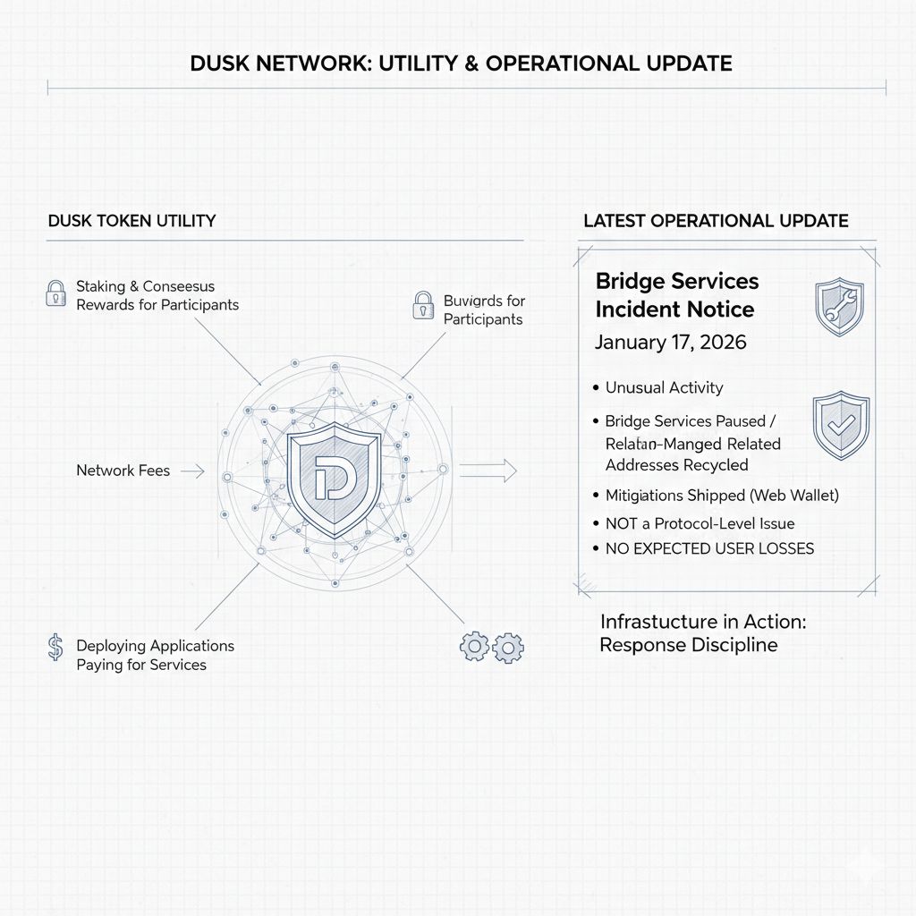 Al observar “últimas actualizaciones”, la actualización operativa oficial más concreta en las últimas semanas ha sido el Aviso de Incidente de Servicios de Puente datado el 17 de enero de 2026, donde Dusk declaró que una actividad inusual involucraba una billetera gestionada por el equipo utilizada en operaciones de puente, que los servicios de puente fueron pausados, que las direcciones relacionadas fueron recicladas, y que se implementaron mitigaciones en la billetera web, mientras también enfatizaban que no fue un problema a nivel de protocolo y que no esperaban que se materializaran pérdidas para los usuarios, y sin importar cómo se sienta alguien sobre los incidentes en general, este tipo de momento es importante porque muestra la diferencia entre los proyectos que hablan como infraestructura y los proyectos que realmente tienen que actuar como infraestructura, ya que una vez que una red toca puentes, billeteras y rieles operativos, la disciplina de respuesta se convierte en parte de la experiencia del producto.