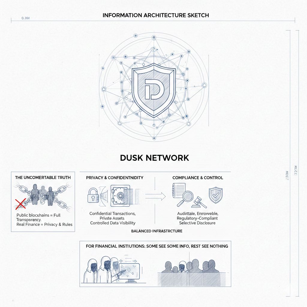 Cuando Dusk se describe a sí mismo como una blockchain de privacidad para aplicaciones financieras, no está tratando de competir en la carrera de 'quién puede esconder más', está tratando de construir el tipo de infraestructura que puede albergar activos y transacciones donde la confidencialidad es un requisito, mientras que las auditorías, la aplicación y el cumplimiento aún deben existir de manera controlada, porque las instituciones no operan en un entorno donde todo es totalmente visible o totalmente oculto, operan en un entorno donde algunas partes deben ver alguna información en algunos momentos, y el resto del mundo no debería ver nada en absoluto.