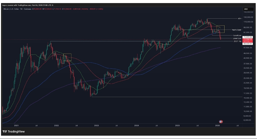 С момента достижения исторического максимума в октябре 2025 года цена Биткоина оказалась в ловушке падающего тренда. Флагманская монета сформировала нижние минимумы и пробила свою ключевую зону покупки около 80 тысяч долларов, чтобы повторить свой пик 2021 года.
