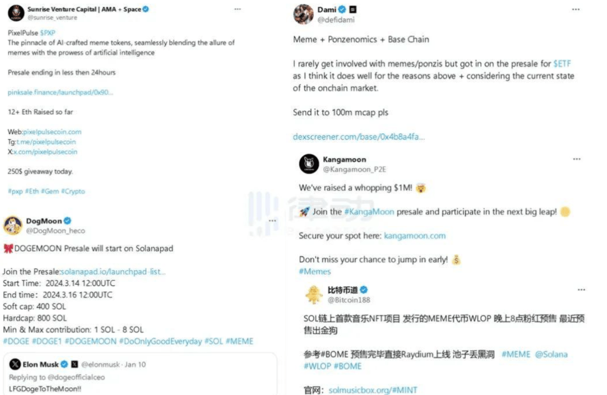 Además de POGAI, hay muchos proyectos de memes como KANG, una moneda de memes que combina funciones SocialFi y P2E, Byte, el token más grande basado en memes y utilidades en Blast (la preventa comenzó el 15 de marzo), MOOLANA (15 de marzo). ) Las preventas comenzarán el día 15), el meme conceptual de IA PXP (se han recaudado más de 12 ETH), etc., también comenzarán las preventas.