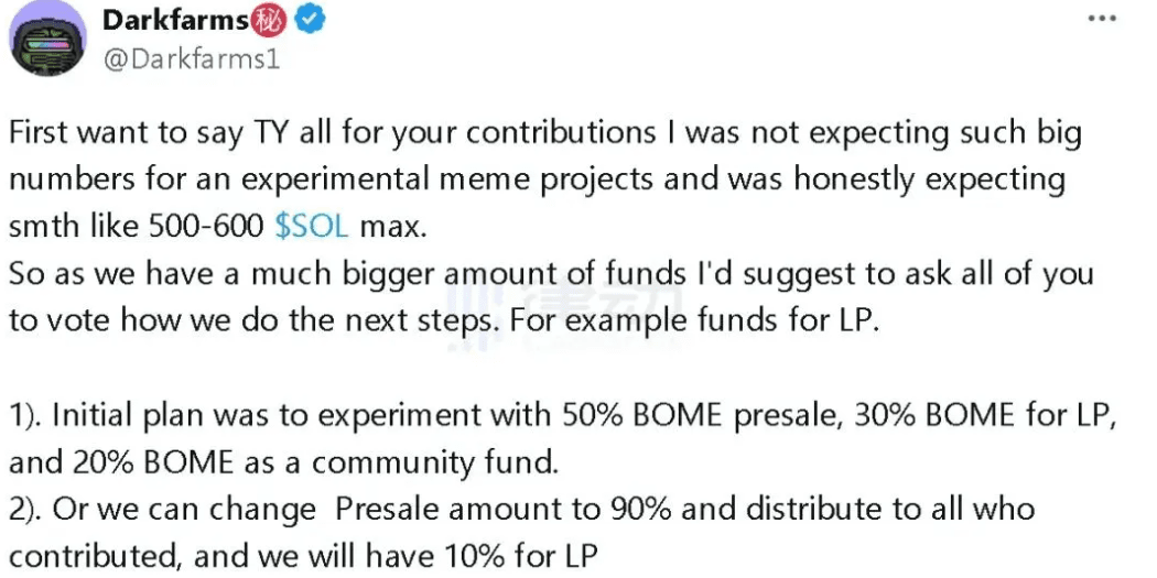 Inicialmente, Darkfarms esperaba recaudar entre 500 y 600 SOL. A medida que la preventa avanzó mucho más allá de las expectativas, Darkfarms abrió una votación comunitaria para permitir que los participantes decidieran cómo asignar los fondos de la preventa. El día 15, según datos divulgados por Darkfarms, se recaudaron un total de 10.131 SOL.