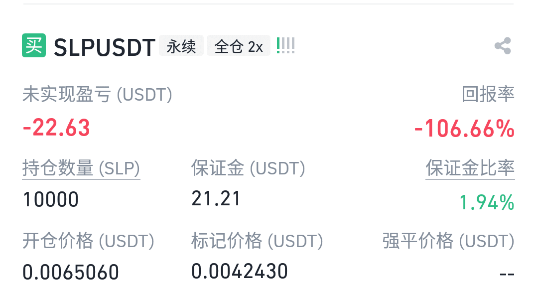 Mi precio de apertura fue 0,0065 y mi margen fue 21,21u, 2 veces. Cuando el precio de la moneda cayó a 0,00325 (-50% veces 2 veces = -100%), perdí todo mi margen: 21,21u, ¿por qué es el actual? precio 0.00425 (≈-35%), ¿ya he perdido más que mi capital? (No debería ser una pérdida (0.00425-0.0065)÷0.0065×100%×2×21.21≈-14.8u)