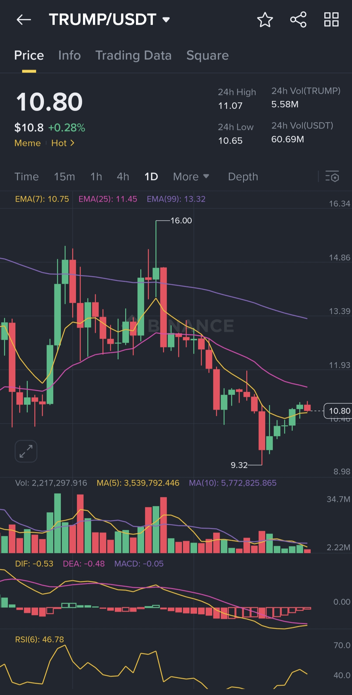 TRUMP/USDT montre un biais baissier en dessous de $11.07, mais le support à court terme tient :
