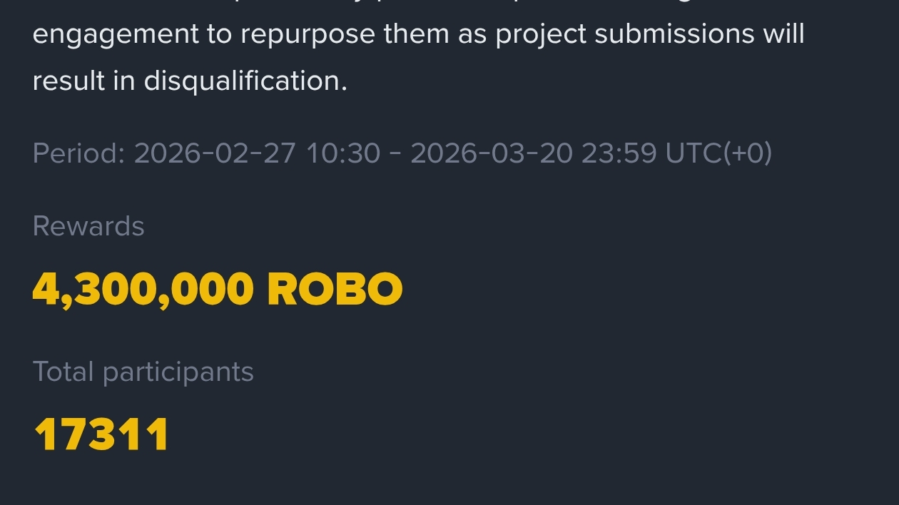 Publiez au moins un contenu original sur Binance Square, d'une longueur d'au moins 100 caractères et d'au plus 500 caractères. Le post doit mentionner le compte projet @, taguer le token $ROBO et utiliser le hashtag #ROBO. Le contenu doit être fortement lié à la Fondation Fabric et $ROBO et doit être original, non copié ou dupliqué. Cette tâche est en cours et se rafraîchit quotidiennement jusqu'à la fin de la campagne et ne sera pas marquée comme complétée.