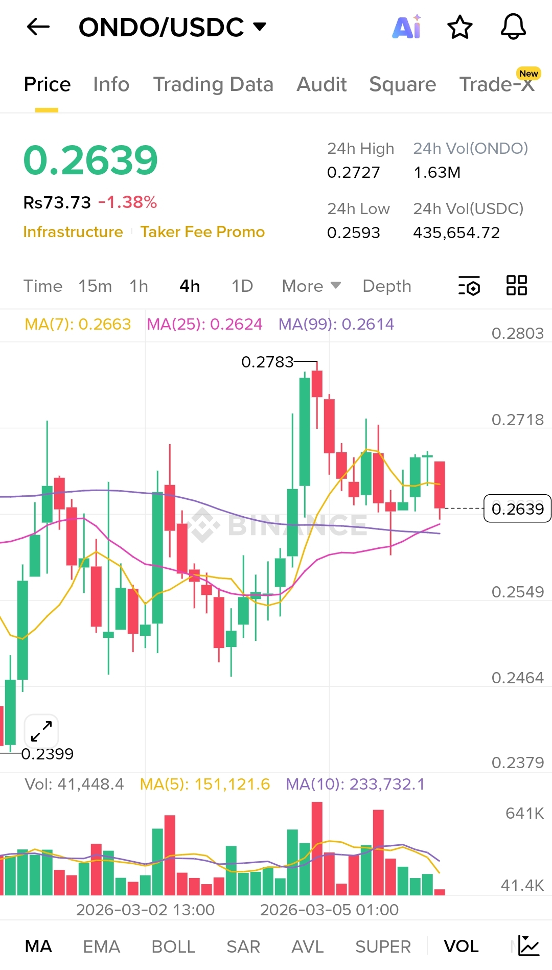 Le graphique ONDO/USDC 4H montre une période de consolidation saine aprÚs un pic récent à 0.2783.