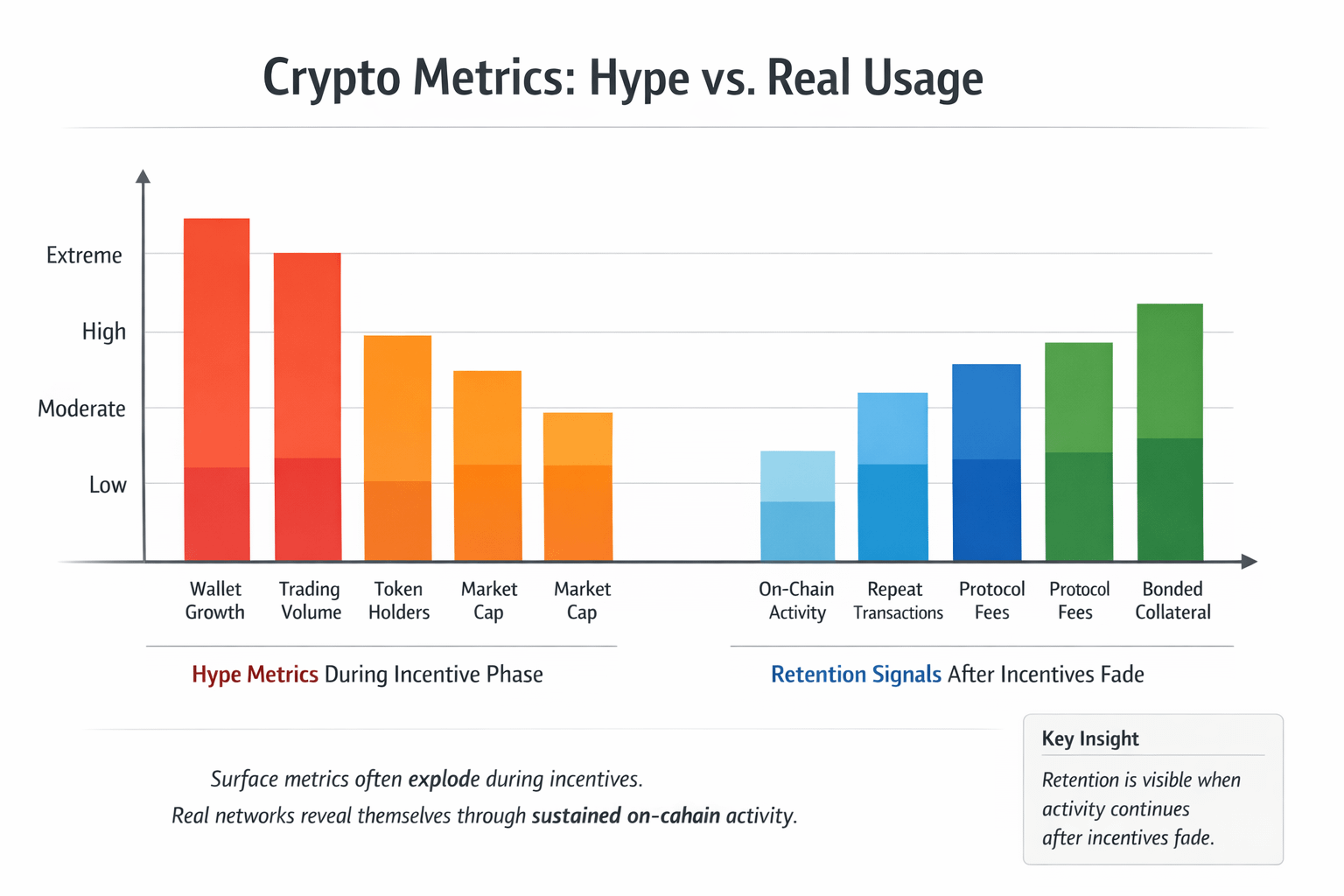 A few years ago I held a token that looked unstoppable. Wallet growth was exploding, volume was huge, and every dashboard screenshot on crypto Twitter made it feel like adoption was inevitable. The chart looked healthy, the community was loud, and every metric people love to share was pointing up. Then the incentives faded. Liquidity mining ended, rewards slowed down, and within a couple months the network turned into a ghost town. The wallets were still technically there, but the activity had vanished. That cycle burned something into my brain: most crypto metrics look great during the hype phase, but very few systems survive the moment when incentives fade.