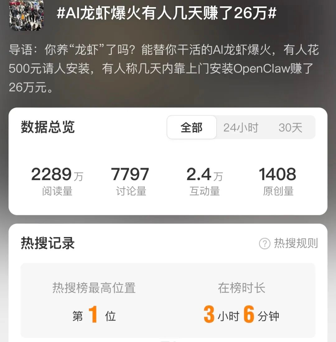Mais c'est toujours la même chose, se concentrer sur l'anxiété pour faire des affaires, cela rapportera certainement beaucoup d'argent, par exemple en installant OpenClaw, certaines personnes ont gagné des centaines de milliers en quelques jours, comme le sujet en tête des tendances aujourd'hui - le homard AI qui a explosé, certaines personnes ont gagné 260 000 en quelques jours.