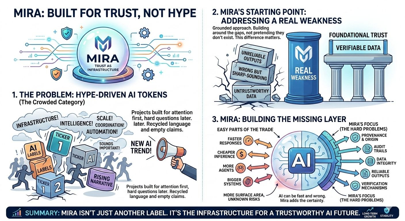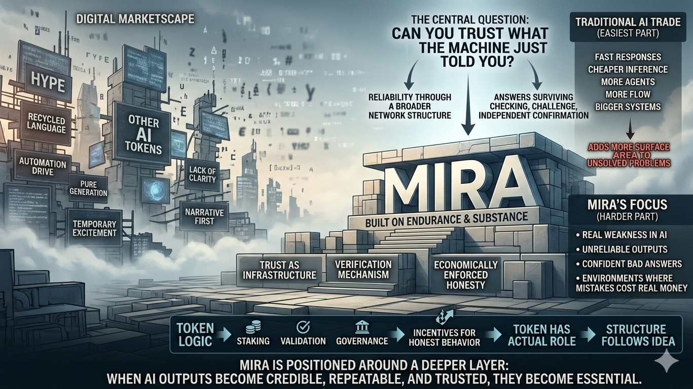 What keeps Mira in my head is that it doesn’t feel like one of those AI tokens that appeared just because the market needed a new label to chase. That category is already crowded with projects that know how to sound important before they’ve proven anything at all. You see the same recycled language over and over again: infrastructure, intelligence, scale, coordination, automation. It all starts to blur after a while. Most of it is built to catch attention first and answer hard questions later.