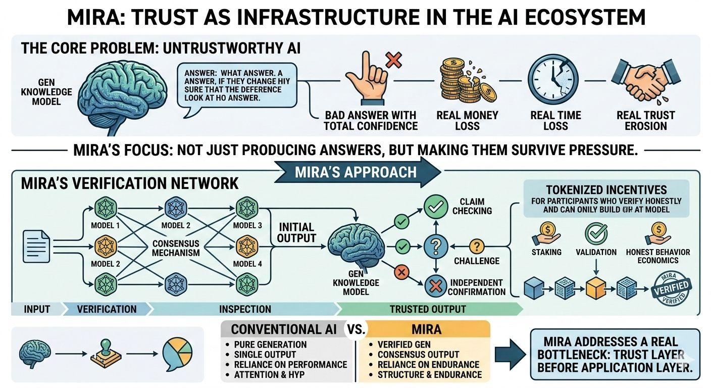 From what the project has outlined publicly, Mira is trying to treat trust as infrastructure instead of as branding. The logic is simple, but the implications are serious. Instead of relying on one model, one output, one chain of reasoning, Mira leans into verification through a broader network structure. The point is not just to produce an answer. The point is to make that answer survive checking, challenge, and independent confirmation. That changes the conversation immediately. It takes AI out of the territory of pure generation and pushes it closer to something that can be inspected.