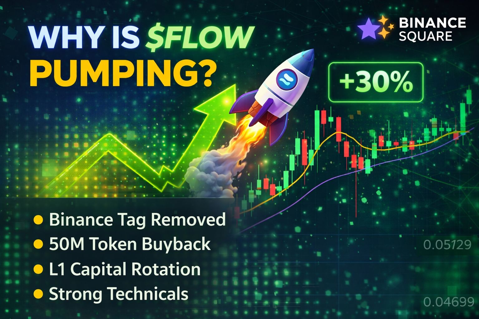 The recent surge in $FLOW price, which pushed the token above the $0.05 level with more than 30% gains, appears to be driven by a combination of market sentiment, supply changes, and ecosystem updates. One of the biggest bullish factors is the removal of Binance’s monitoring tag, which previously signaled potential delisting risk. Its removal restored confidence among traders and improved market sentiment toward the project. At the same time, the Flow Foundation executed a buyback and burn of more than 50 million FLOW tokens, reducing circulating supply and creating deflationary pressure that can support higher prices when demand increases. �