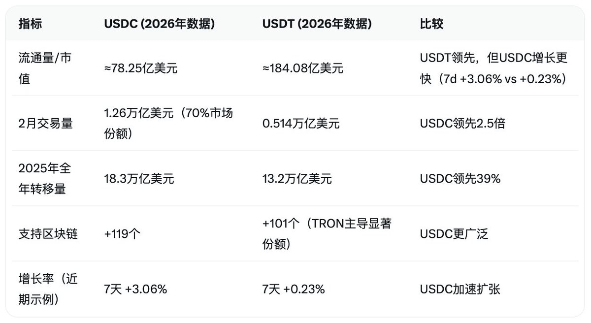 例如,在 #Solana 链上,USDC的总交易量达6960亿美元,远超USDT的760亿美元。Visa数据显示,USDC已占稳定币交易份额的近50%,特别是在机构支付领域。2026年1月,USDC处理了8.3万亿美元的转移量,而USDT仅为1.7万亿美元,尽管USDC供应量更小,这突显其更高的效率。