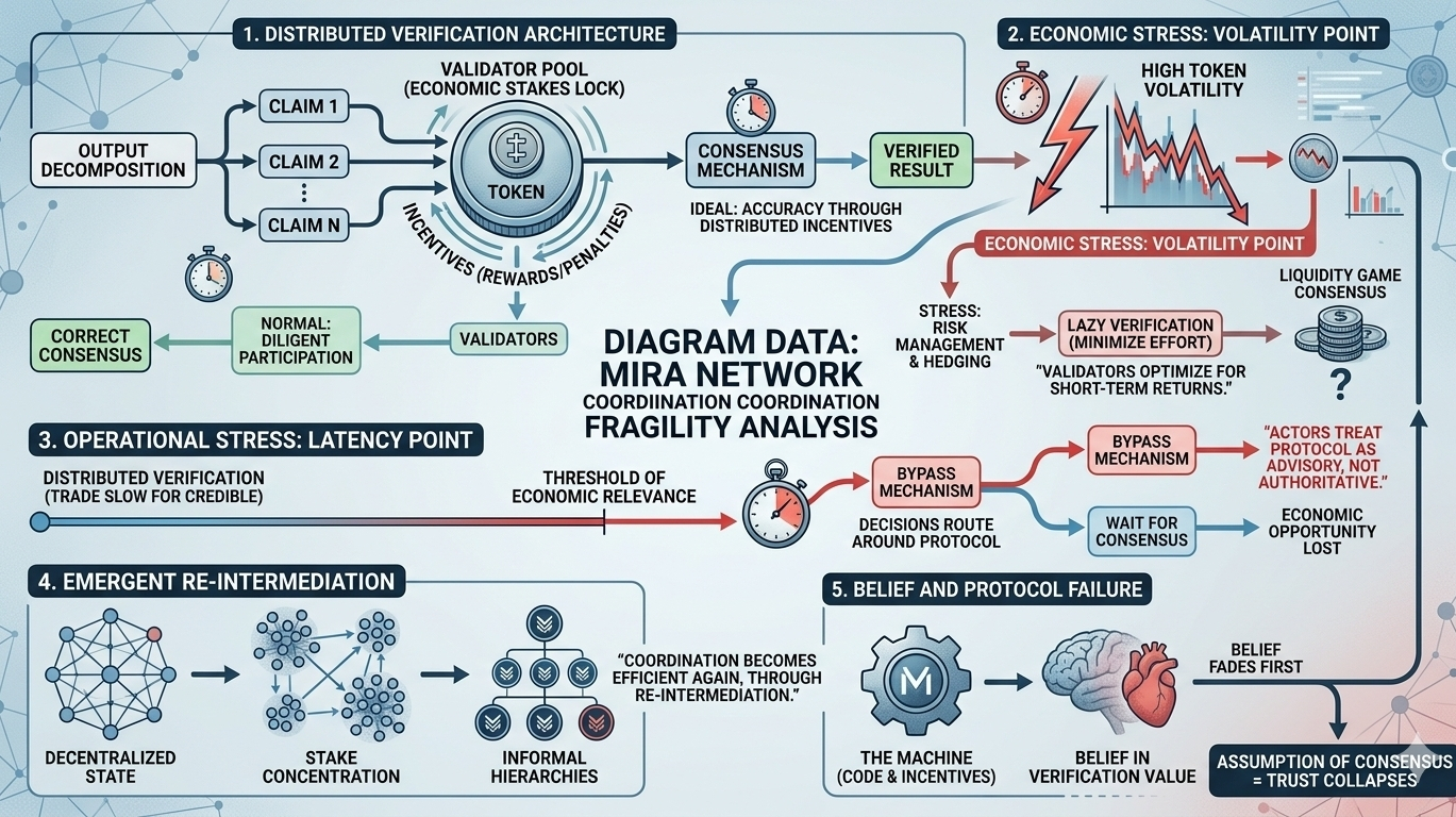 I tend to evaluate coordination systems the same way I watch liquidity move through markets. Narratives arrive first, then capital follows, and eventually stress exposes the difference between architecture and behavior. Protocols that promise to remove intermediaries usually frame themselves as structural upgrades to trust. But when I look at something like Mira Network, I’m less interested in the promise of verification and more interested in what happens when the participants coordinating that verification begin to feel real economic pressure. Systems built around distributed validation assume that incentives will hold participants in equilibrium. Markets rarely respect that assumption for long.