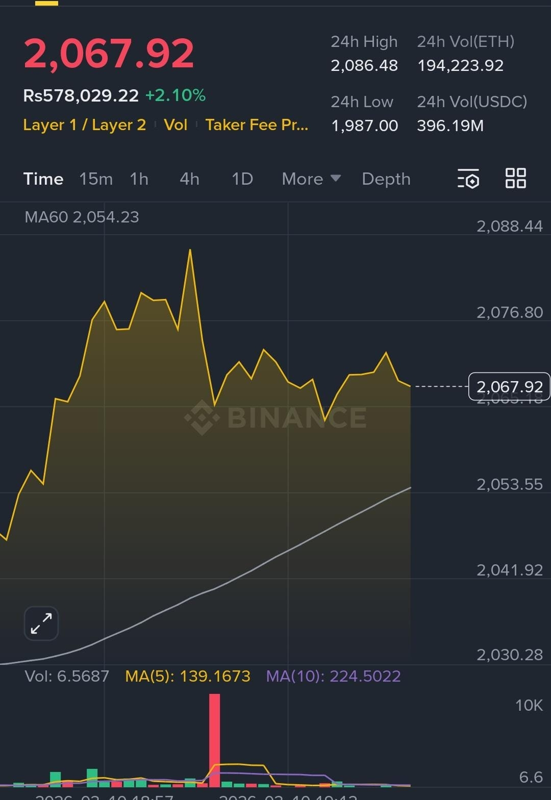 Ethereum continues to show steady momentum in the ETH/USDC trading pair on Binance, with the price currently trading around $2,067 after gaining about 2.10% in the latest session. The market recently reached a 24-hour high near $2,086, indicating that buyers are still active despite short-term fluctuations on the lower timeframes. The chart suggests that Ethereum experienced a strong push upward before entering a brief consolidation phase, where price movements are stabilizing around the $2,060â$2,070 range. This zone is now acting as a key short-term support area. Trading volume also showed a noticeable spike during the recent move, signaling that market participants stepped in aggressively during the upward momentum. As long as Ethereum maintains its position above the $2,050 region, the bullish structure on the short-term chart remains intact.