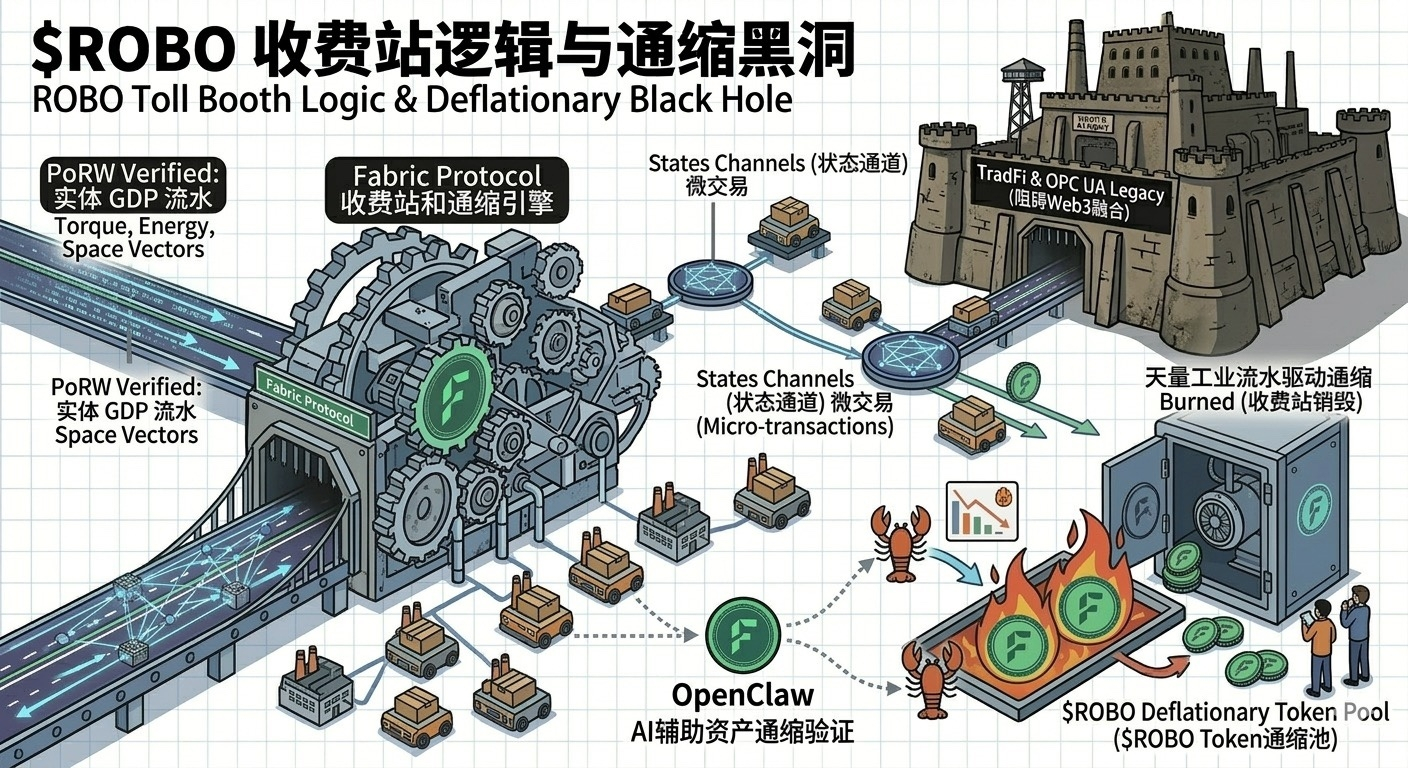 当信任天堑被填平,为了承载黑灯工厂里极度高频的设备运转,Fabric 必然采用了状态通道技术。物流小车和加工机器建立链下通道,协作的每一秒都在进行微厘级别的 ROBO 结算。直到订单完工,净结算余额提交主网打包。而就在并网的瞬间,庞大的实体工业流水直接驱动 ROBO 作为网络安全验证费被消耗,这是一种极其恐怖的、锚定真实世界 GDP 的通缩模型。