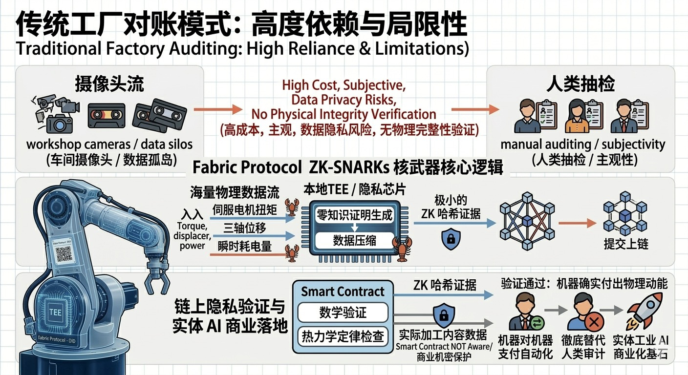 传统工厂的对账高度依赖车间摄像头和人类抽检,而 Fabric 掏出了密码学领域的核武器——ZK-SNARKs(零知识证明)。机械臂的伺服电机扭矩、三轴位移、瞬时耗电量,这些海量的物理数据,会在本地芯片中被压缩成极小的哈希证据提交上链。