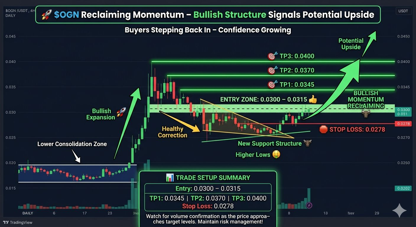 La structure actuelle du marché suggère que les haussiers reprennent le contrôle. Si le prix reste au-dessus de la région de support clé et que l'élan continue de se construire, $OGN could prolonger son rallye vers les prochains niveaux de résistance et pourrait créer un nouveau sommet à court terme.