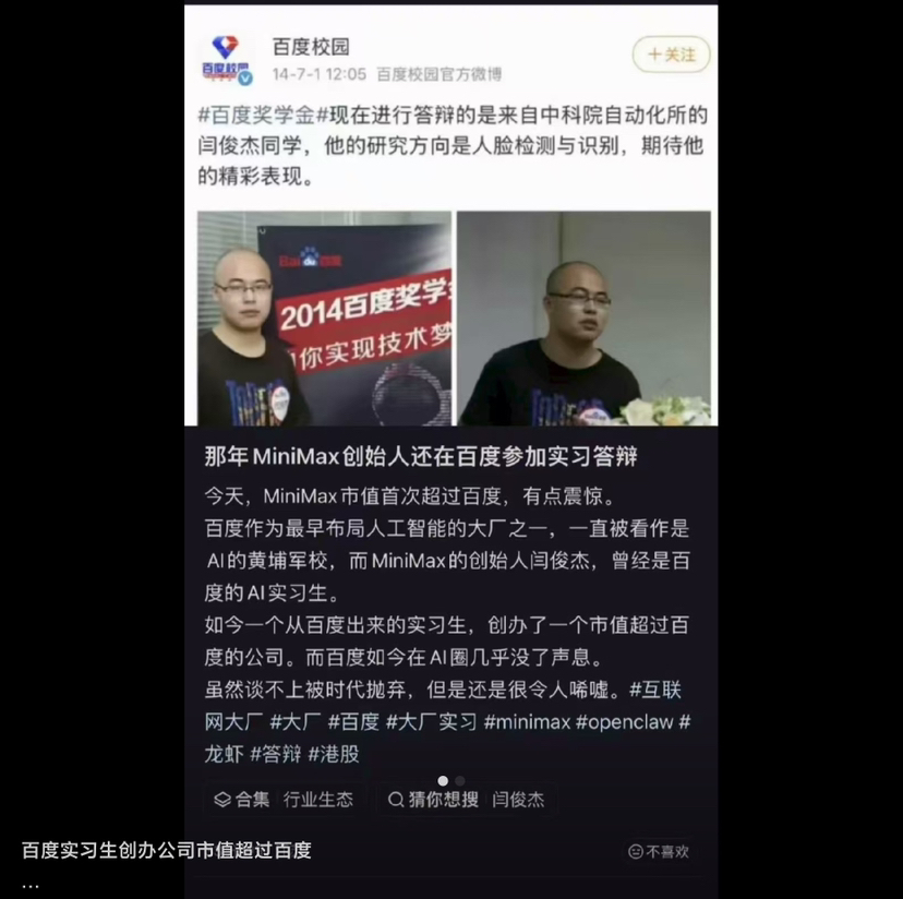 MiniMax的崛起,是中国AI产业的一次“结构性胜利”。它证明了:在AI时代,技术路线、全球化能力和资本叙事,比“出身”更重要。百度实习生闫俊杰,用十年时间完成了从“跟随者”到“引领者”的蜕变,也为中国AI的下一个十年,写下了浓墨重彩的一笔。
