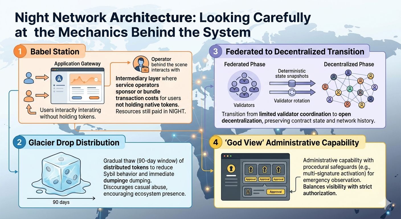 Je comprenais que l'architecture derrière le réseau de Night nécessite de regarder au-delà des mécanismes de surface et de se demander comment ses choix d'infrastructure façonnent le comportement réel. Plusieurs éléments de Babel Station, la période de dégel de Glacier Drop, la transition du contrôle fédéré et la controversée « vue de dieu » suggèrent un système tentant d'équilibrer l'utilisabilité avec de strictes contraintes économiques. Que ces équilibres tiennent dans le temps reste une question ouverte.