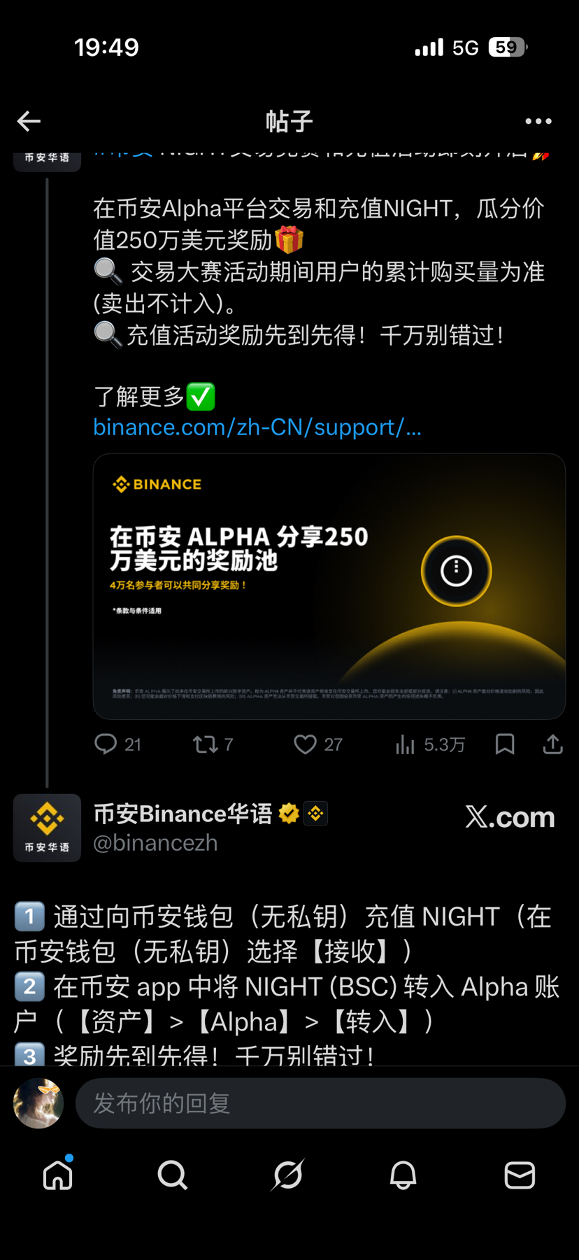 Alpha充值奖励:19910000枚Night。由前18100名完成1200night充值与转账任务的合格用户均分,每人可得1100枚,占代币总量百分之0.083。