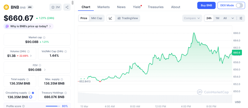 BNB se négocie à 660 $ selon CoinMarketCap au 15 mars, en hausse de 11 % au cours du mois dernier mais portant toujours le poids de l'examen du DOJ. Les rapports d'éventuelles violations de sanctions ont créé une incertitude que le graphique technique ne peut surmonter.