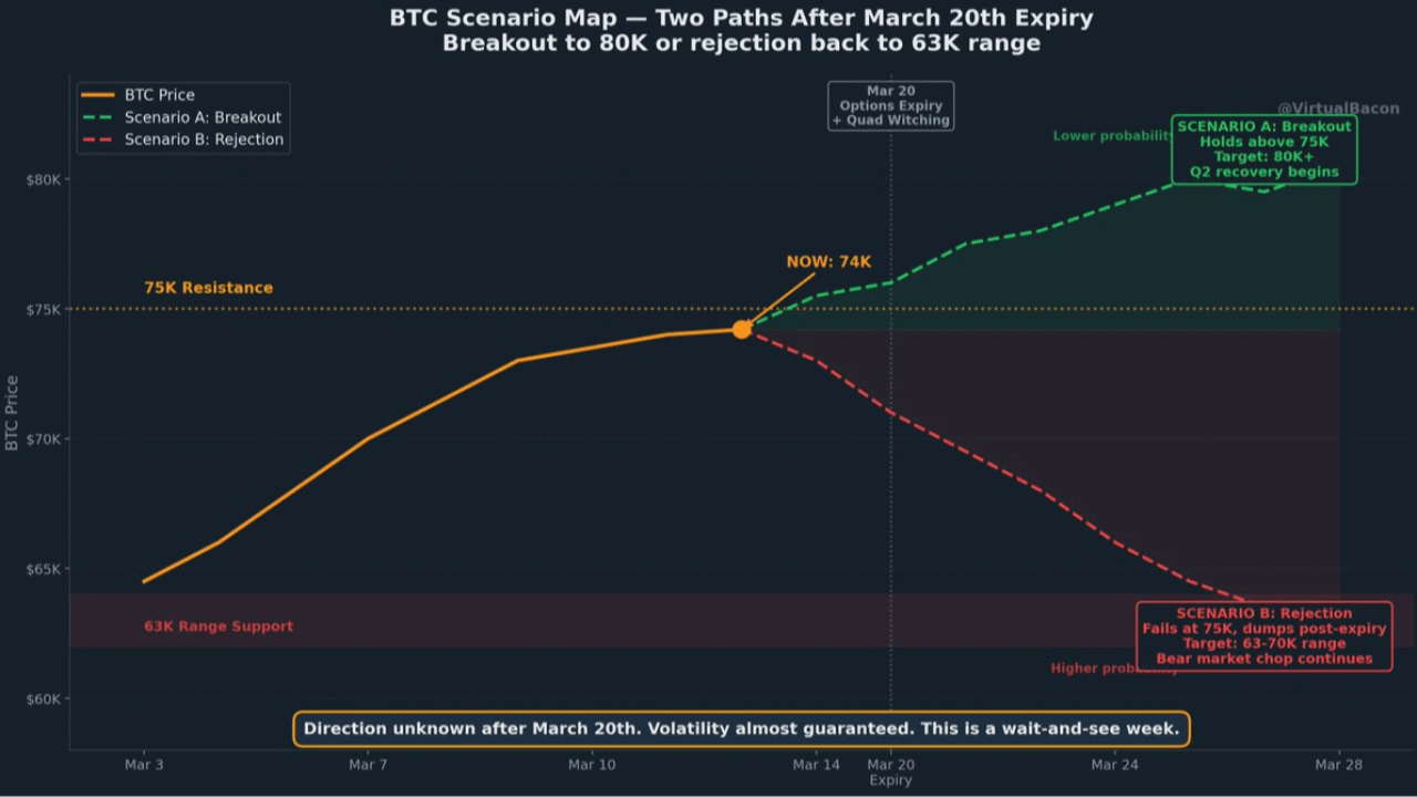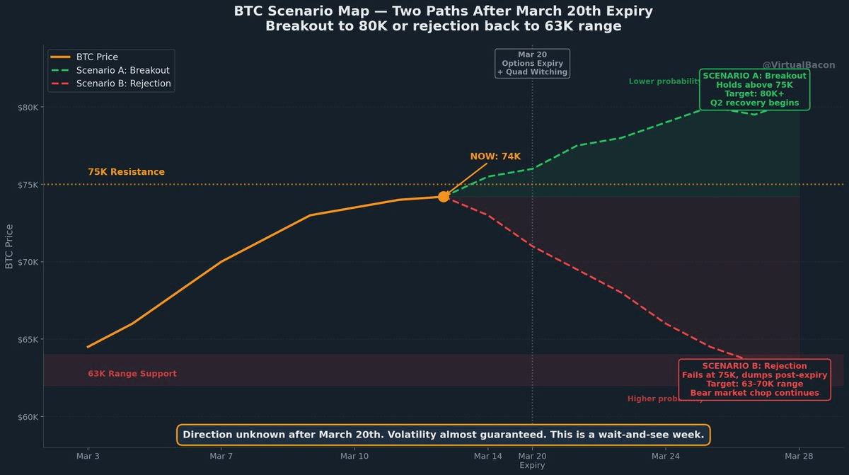Après vendredi : Tous les paris sont ouverts. Si le BTC dépasse 75K $, le mouvement pourrait s'amplifier jusqu'à 80K $. S'il chute en dessous de 70K $, cela s'amplifie aussi.