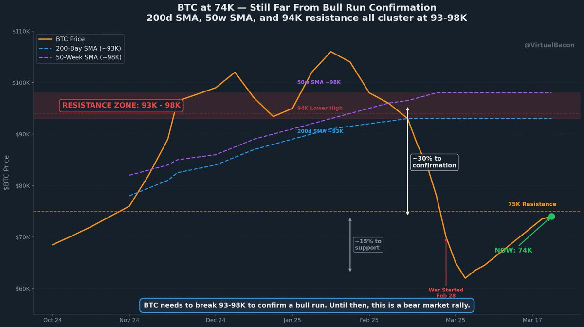 Ce n'est pas moi qui suis baissier. C'est juste des mathématiques. Nous sommes dans un marché baissier jusqu'à ce que le BTC dépasse 94-98K $ de manière convaincante.