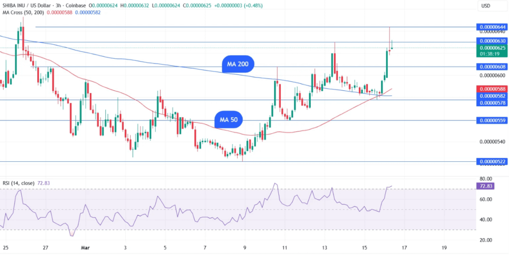 Le prix a dépassé la moyenne mobile journalière de 50 jours près de 0,00000621 $ pour la première fois depuis janvier, déplaçant le sentiment à court terme vers les acheteurs.