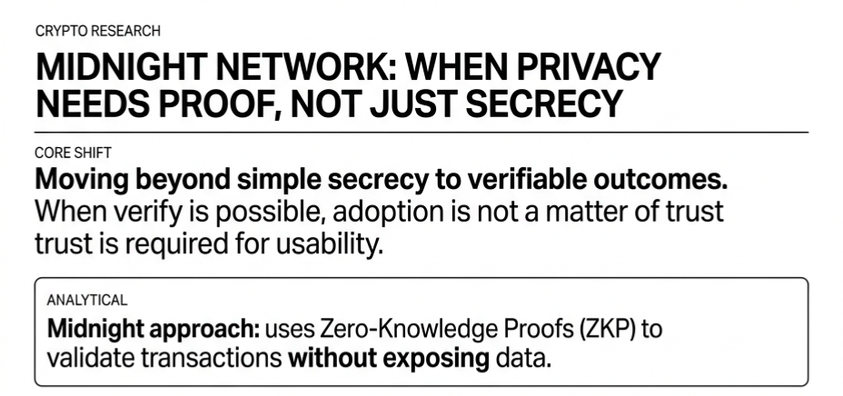 Je me souviens quand j'ai commencé à prêter attention aux projets de confidentialité en crypto. À l'époque, je croyais que cacher les transactions suffisait à créer de la valeur. Si les utilisateurs pouvaient déplacer des fonds sans être suivis, la demande suivrait naturellement. Mais au fil du temps, j'ai remarqué que quelque chose ne collait pas. Beaucoup de ces systèmes avaient une technologie solide, mais très peu d'utilisation réelle. Le problème n'était pas la confidentialité elle-même, c'était la confiance. Si personne ne peut vérifier ce qui se passe, le système devient difficile à croire. Cette réalisation a changé ma façon d'évaluer les projets aujourd'hui. Maintenant, je me soucie moins de ce qu'un système cache et plus de la manière dont il prouve que tout fonctionne comme prévu. Ce changement de pensée est exactement pourquoi Midnight Network a attiré mon attention. Non pas parce que la confidentialité est un nouveau récit, mais parce qu'il aborde le problème différemment. Au lieu de se concentrer uniquement sur la dissimulation des données, il pose une question plus pratique. Une blockchain peut-elle garder les informations privées tout en prouvant que les transactions sont valides ?