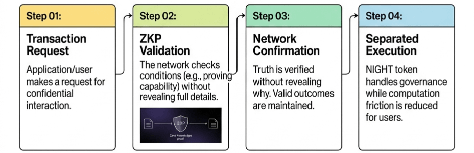 Cela change complètement la discussion. La véritable question n'est plus une question de secret, mais d'utilisabilité. Si les utilisateurs et les développeurs ne peuvent pas faire confiance aux résultats du système, alors la confidentialité seule ne résout rien. Selon sa conception, Midnight utilise des preuves à connaissance nulle pour valider les transactions sans exposer les données sous-jacentes. En termes simples, le réseau confirme que quelque chose est vrai sans révéler pourquoi c'est vrai. Une façon utile d'y penser est de prouver que vous pouvez vous permettre un échange sans montrer votre solde complet. Le validateur vérifie la condition, pas les détails. Cela importe parce que cela permet aux applications de fonctionner dans des environnements où la confidentialité est requise, tels que l'identité, la finance ou l'utilisation en entreprise, tout en maintenant des résultats vérifiables. Le protocole sépare également la propriété de l'exécution en utilisant le jeton NIGHT pour la gouvernance, tandis que les ressources computationnelles sont gérées différemment, ce qui aide à réduire les frictions pour les utilisateurs interagissant avec les applications.