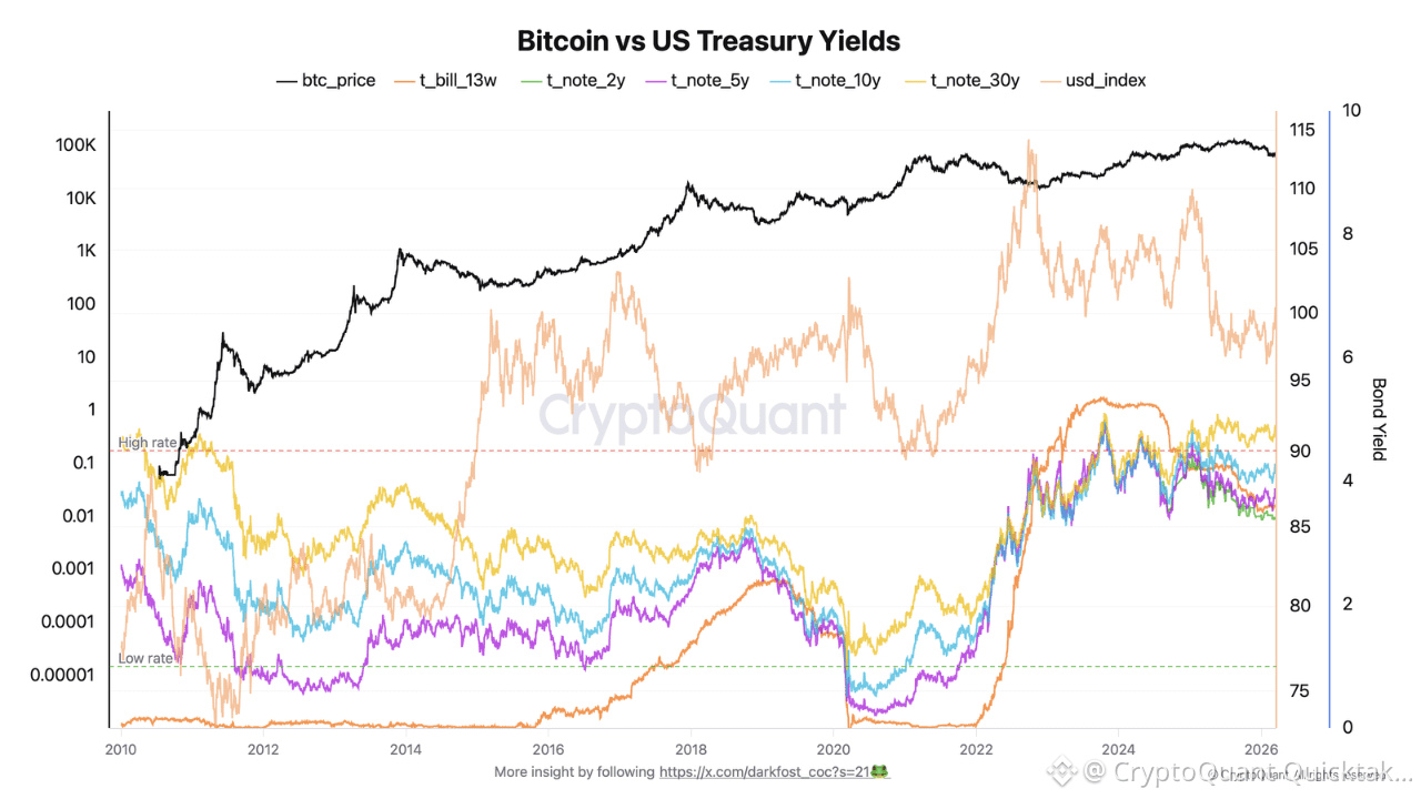 The chart illustrates that periods during which the dollar and treasury yields become too strong tend to create an unfavorable environment for an asset like Bitcoin. Higher interest rates constrain global liquidity. It becomes more difficult to borrow, invest, or finance activity when rates begin to rise again.