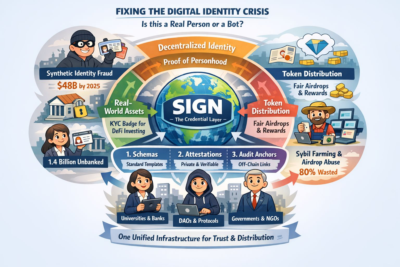 The numbers are staggering. Deloitte projects that synthetic identity fraud—where criminals stitch together real and fake information to create phantom people—will hit $48 billion by 2025. The World Bank tells us 1.4 billion adults are locked out of the financial system simply because they lack paperwork to prove who they are. And in crypto, we're burning billions on airdrops that get vacuumed up by sybil farmers running thousands of bots, while real users get pennies. DappRadar estimates over 80% of airdrop value never reaches genuine community members.