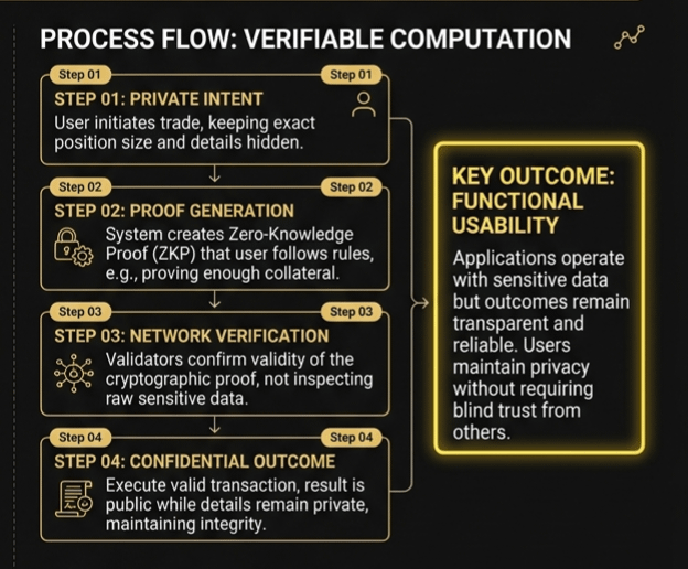 D'après ce que je comprends, la conception fondamentale de Midnight se concentre sur la combinaison de la vie privée avec le calcul vérifiable. Au lieu de simplement cacher les données de transaction, le réseau utilise des preuves cryptographiques pour montrer qu'une transaction est valide sans révéler son contenu. Une façon simple d'y penser est comme soumettre un échange sans montrer votre taille de position exacte, mais en prouvant tout de même que vous aviez suffisamment de garanties et que vous avez suivi les règles. Le système ne demande pas aux autres de vous faire confiance aveuglément. Il fournit une preuve mathématique que tout est en ordre. Cela compte parce que cela permet aux applications de fonctionner avec des données sensibles tout en maintenant l'intégrité. Les développeurs peuvent construire des systèmes où les données des utilisateurs restent privées, mais les résultats restent transparents et fiables. Le jeton et la structure du réseau semblent conçus pour soutenir cet équilibre. Les validateurs jouent un rôle dans la confirmation des preuves plutôt que dans l'inspection des données brutes, ce qui change la façon dont la confiance est répartie à travers le système. Au lieu de compter sur la visibilité, le réseau compte sur la vérification. Si cela fonctionne comme prévu, la demande pour le réseau devrait provenir d'applications ayant besoin à la fois de vie privée et de précision. Cela crée un type de flux de valeur différent par rapport aux chaînes traditionnelles, où l'activité est souvent motivée par la spéculation ou des transferts simples.