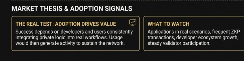 En regardant le côté du marché, il semble que l'attention autour de l'infrastructure de la vie privée soit à nouveau en croissance, mais il est encore tôt. Le comportement des prix et les modèles de volume suggèrent qu'un intérêt est en train de se construire, bien que cela ne soit pas encore constant. Les pics d'activité reflètent souvent un élan basé sur le récit plutôt qu'une utilisation soutenue. La croissance des détenteurs peut indiquer une sensibilisation, mais cela ne confirme pas nécessairement que les utilisateurs s'engagent activement avec le réseau. Dans des situations comme celle-ci, le marché fixe généralement le prix sur le potentiel plutôt que sur la demande prouvée. Cet écart entre l'attente et l'utilisation réelle devient important à surveiller avec le temps. Mais c'est ici que le véritable test apparaît. Le plus grand défi pour Midnight n'est pas de savoir si la vie privée a de la valeur. C'est de savoir si les développeurs et les utilisateurs utiliseront de manière constante un système qui fonctionne de cette manière. Parce que si les applications n'intègrent pas une logique de préservation de la vie privée dans des flux de travail réels, alors le réseau risque de devenir techniquement impressionnant mais sous-utilisé. Et si les utilisateurs n'interagissent pas de manière répétée avec ces applications, le système ne génère pas l'activité nécessaire pour se maintenir. D'autre part, si des projets commencent à construire des outils où des transactions privées mais vérifiables sont nécessaires, et que les utilisateurs commencent à s'y fier régulièrement, le réseau peut développer une base solide. L'utilisation ferait alors monter la valeur, plutôt que l'inverse. Donc, ce qui me rendrait plus confiant dans Midnight, ce n'est pas l'excitation à court terme mais des signes clairs d'adoption.